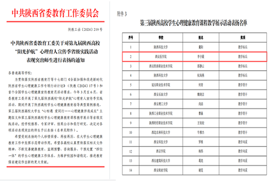 近日,由省委教育工委、省教育厅主办,陕西科技大学承办的第三届陕西高校学生心理健康教育课程教学省级现场展示活动在陕西科技大学举行。来自全省各高校心理健康教育队伍的21名教师参加了决赛。我校学工部大学生心理健康教育发展中心教师李宇晨获“教学标兵”奖,为历届比赛我校选手取得的最佳成绩。